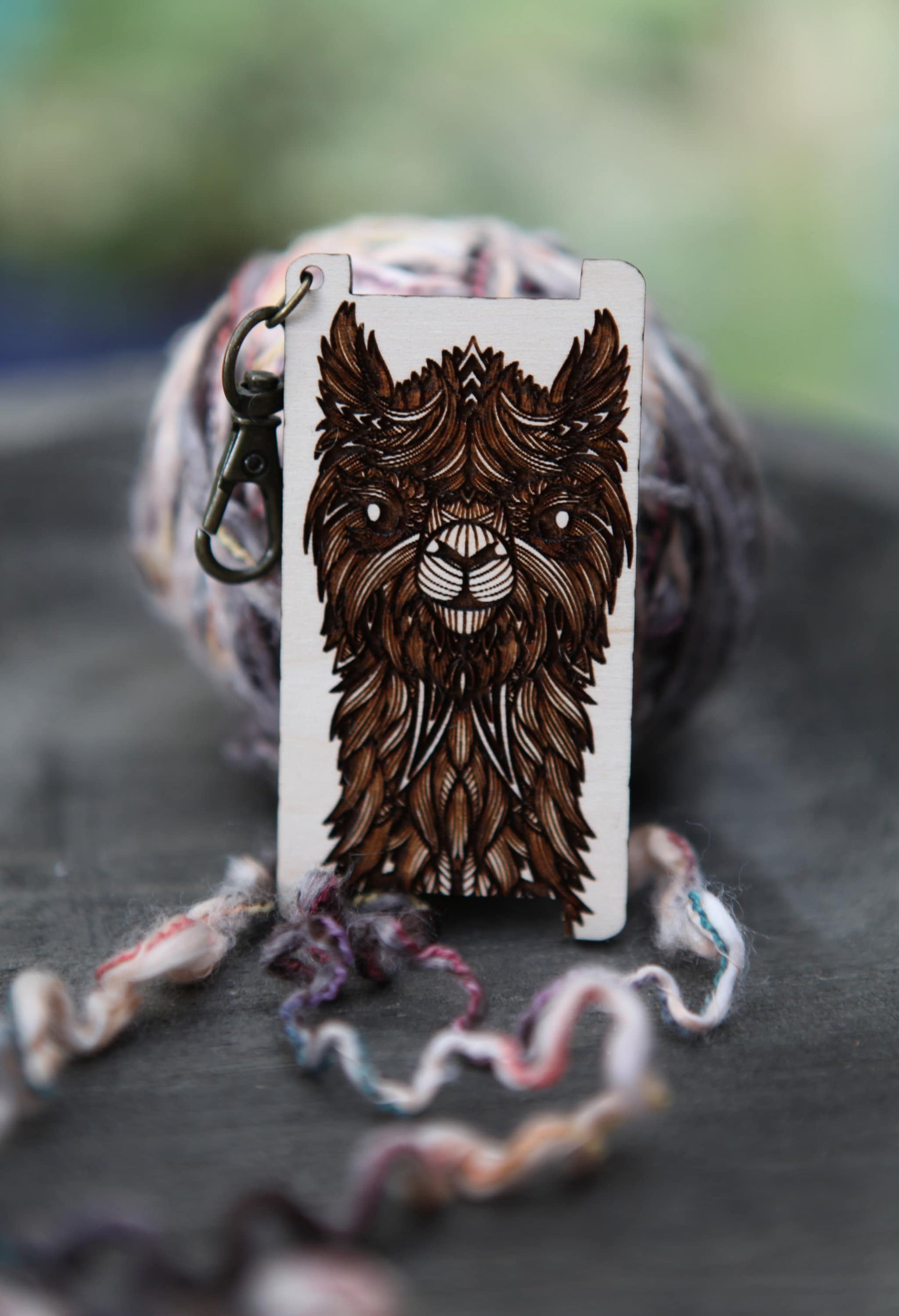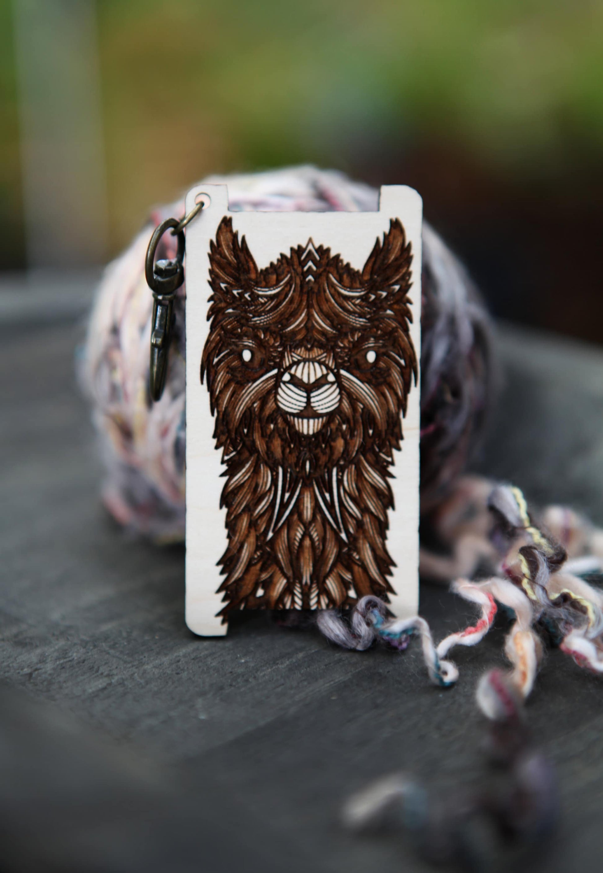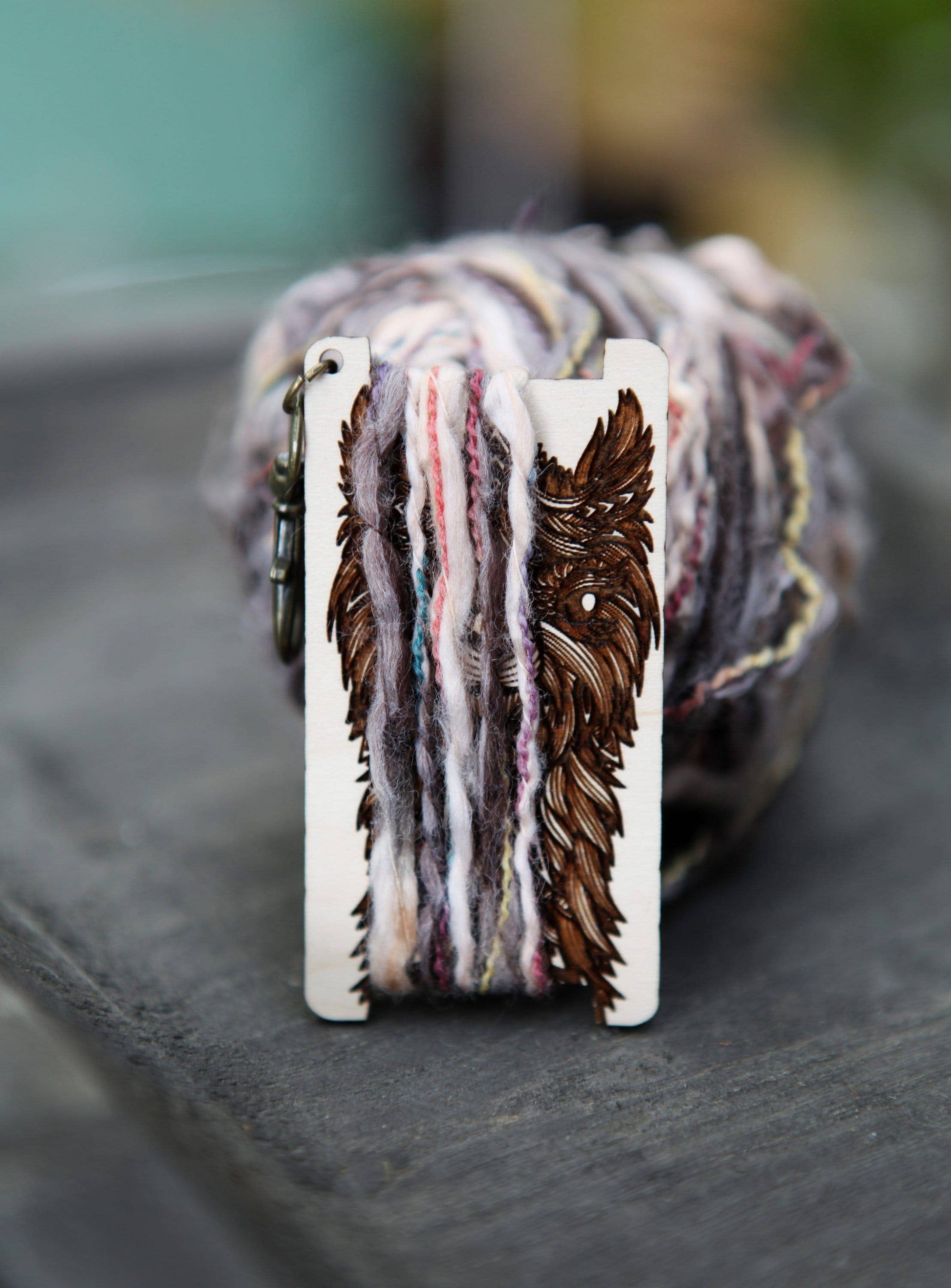 This yarn guide measures about 3 inches tall by 1.5 inches wide and comes with a brass clasp to hang on your knitting bag.