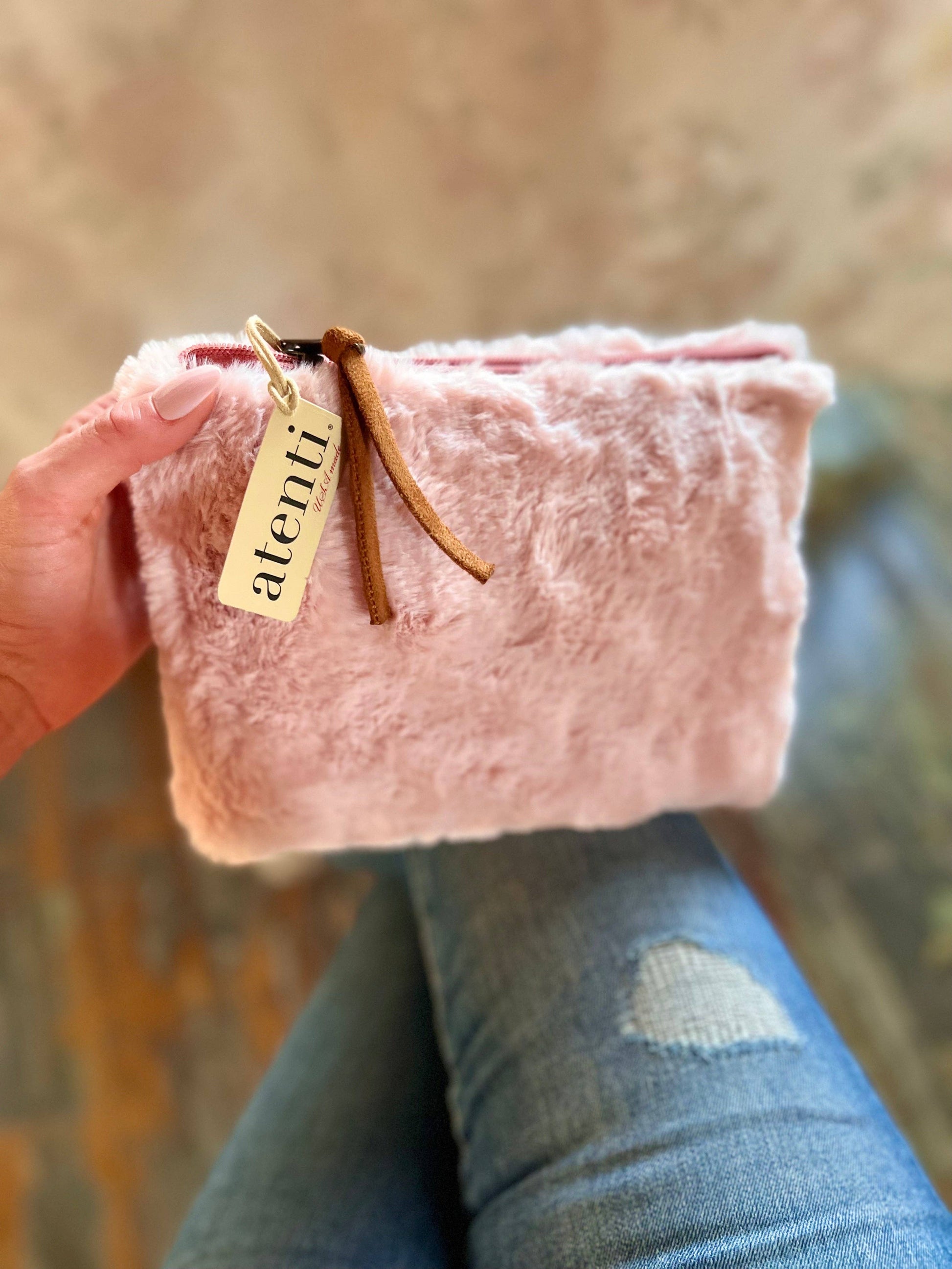 Faux fur? We're fur real! A classic, soft blush fur will have you tickled pink. Time for a wintery vaca! Get the cozy, warm feeling of security you crave in an incredibly stylish package. The Atenti Accessories Pouch has an 8” zippered opening. Fully lined in water resistant taffeta.