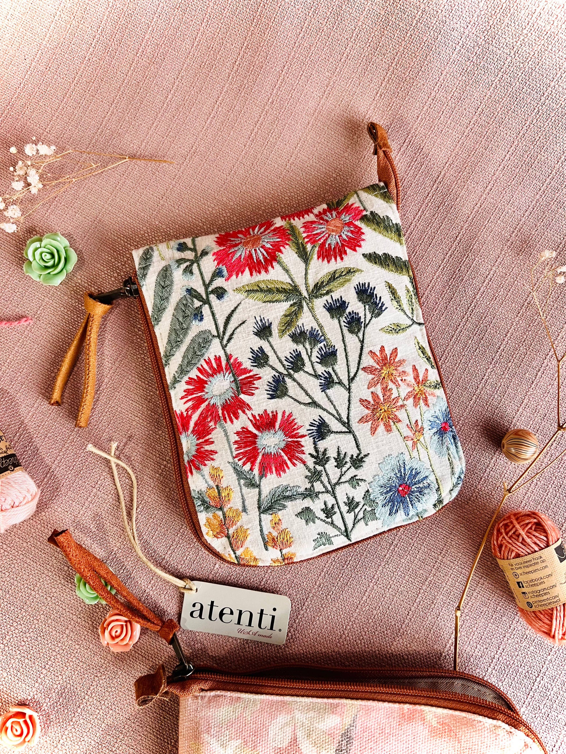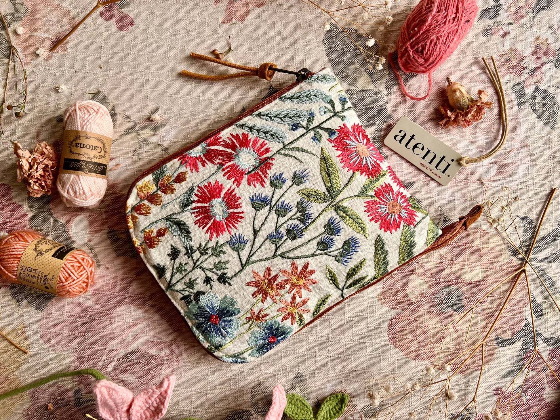 The Wildflower Circular Case is adorned with beautifully embroidered spring flowers on a heavy duck canvas and is sure to become a new, fresh favorite. A practical organizer and storage for your circular needles in distinctive Atenti fabrics. An all around zipper closure protects an interchangeable plastic booklet insert with 12 clear pockets. Additional insert booklets available.